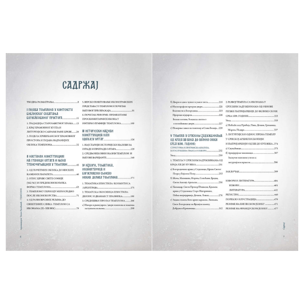 Ова књига има за циљ да обједини резултате истраживања о настанку и развоју преграде олтара из домена више научних области, упореди их и синтетизује, као и да допуни досадашња сазнања и одговори, између осталог, на питања: када и у којим околностима настаје и развија се олтарска преграда хришћанских храмова, када се она трансформише у темплон, како је темплон изгледао у предиконоборачкој и постиконоборачкој фази, како се развијао у каснијем средњовековном раздобљу и којим је називима именована ова конструкција у поменутим периодима. У њој су анализирани најзначајнији појединачни делови темплона, писани извори који помињу одељивање олтара почевши од IV века, уз преглед аутентичних ликовних представа старих конструкција које су одвајале олтар, a од којих су најстарије међу њима у рукописима IX и X века. Све ово разматрано је упоредо са археолошким открићима, тј. значајним материјалним остацима древних преграда олтара, уз увид у корпус сачуваних средњовековних двери и икона у фреско-техници и на дрвеном носиоцу, које су некада биле позициониране на темплону. Развој темплона стоји у директној вези са теологијом обликовања хришћанских храмова, коме претходи значајан период старозаветног храмовног култа и ранохришћанског богослужења, што је у књизи такође изложено. У њеном последњем делу начињен је преглед најважнијих темпла у српским задужбинама од краја XII века до Велике сеобе Срба 1690. године, до када Срби теже да задрже њихову предањску форму. Прати га студија о литургијском односу према темплу у Српској архиепископији и патријаршији од XIII до XVII века, начињена на основу анализе српских рукописних служабника и архијерејских чиновника насталих и употребљаваних на поменутом подручју у наведеном периоду. Због чињенице да темпла у српској средини током читавог периода који је разматран иду највише до два реда невеликих икона изнад престоног низа, ова књига се не дотиче феномена високог многоредног иконостаса који се појавио у Русији у периоду од XV до XVII века.
